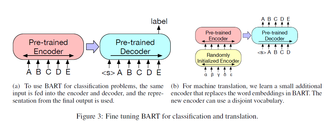 When fine-tuning, for classification tasks, the same sentence sequence is fed into the encoder and decoder, and the final hidden state is used for prediction; for generation tasks, the BART architecture naturally has a decoder; for NMT especially, BART uses a randomly initialized encoder (same architecture as the pre-trained encoder in BART) to serve as the encoder for another language, thus BART can preserve its pre-trained knowledge on the monolingual data.
