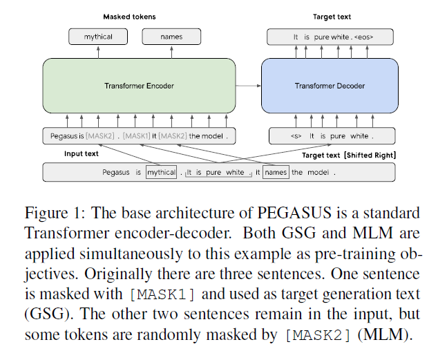 Highlights The reason behind the success of PEGASUS is the simultaneous usage of sentence-level mask and word-level mask, which enables the model to understand the meaning of sentences (word-level mask, doing language modeling) and to comprehend the content of the sentence in the document (sentence-level mask, doing sentence-level comprehension). These two objectives make the model suitable for summarizing over documents while maintaining good “reading” ability.
