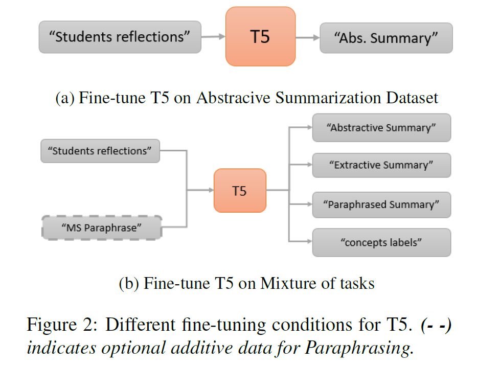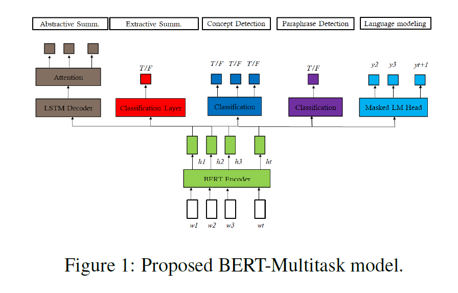 For BERT, in extractive summarization, a linear layer is added after the encoder’s outputs to classify which sentence is selected with input format of $[CLS]\,DW_1,\,…,DW_n\,[SEP]SW_1,\,…,SW_m$ where $DW_i$ is the $i$-th word of the document and $SW_j$ is the $j$-th word of the sentence to be classified. For concept detection, the model classify whether the word in a sequence is part of a concept extracted by a TF-IDF algorithm and the paraphrasing detection task asks the model to decide whether two input sentences $[CLS]\,Sent_1\,[SEP]\,Sent_2$ express the same idea with different phrasing. The language modeling task is directly from BERT. Note that when training, the paraphrasing detection task uses the MSRP dataset to train (which introduces new data) and the rest tasks all take the same dataset to do multitask learning (which in fact provides a multi-view towards the same data for the model). The overall training strategy for BERT is shown as follows.